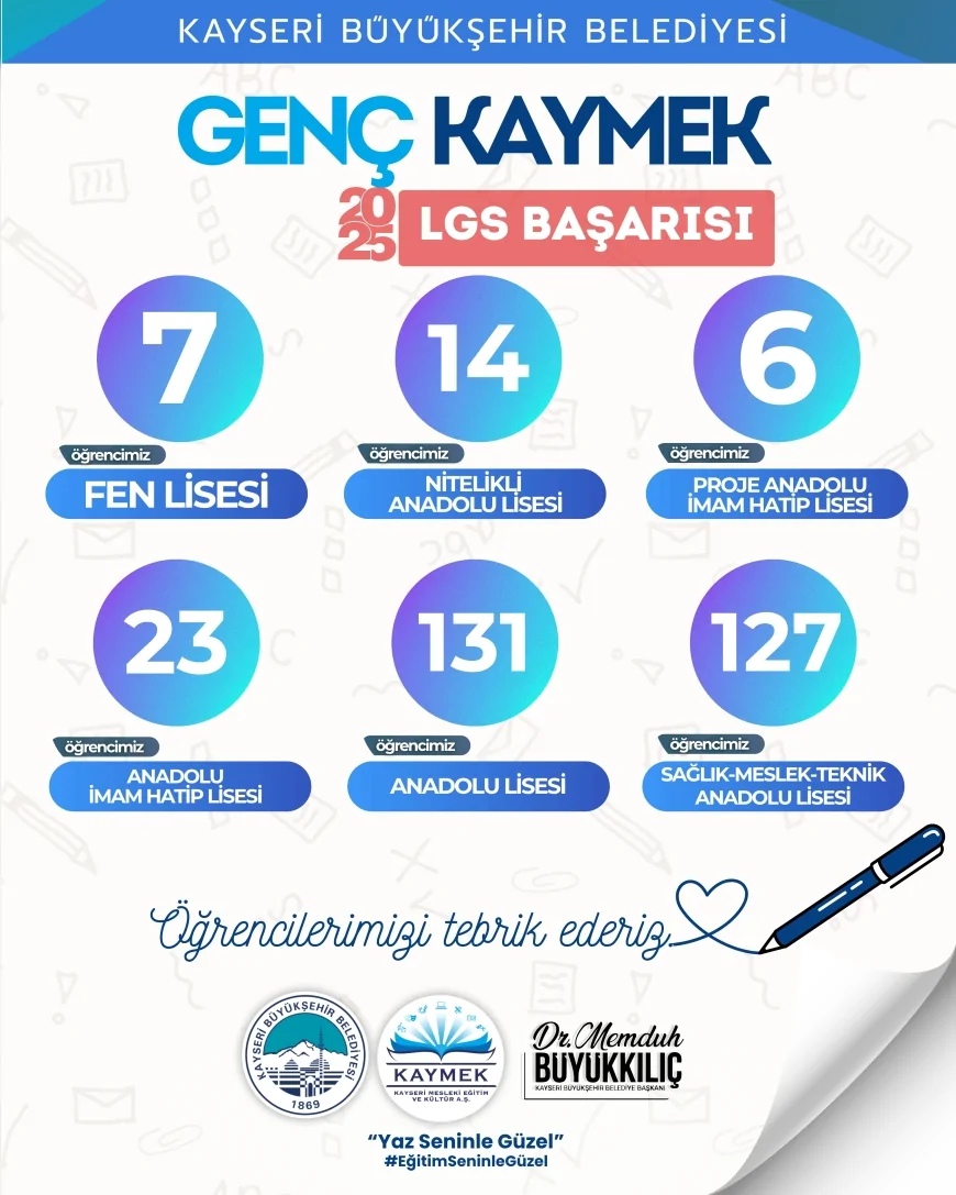 2024 yılı Liselere Geçiş Sistemi (LGS) sonuçlarına göre Genç KAYMEK bünyesindeki kurslara katılan 308 öğrenci, çeşitli liselere yerleşmeye hak kazandı. KAYMEK, bu yıl 7 öğrencisini Fen Liselerine, 14 öğrencisini Nitelikli Anadolu Liselerine, 6 öğrencisini Proje Anadolu İmam Hatip Liselerine, 23 öğrencisini Anadolu İmam Hatip Liselerine, 131 öğrencisini Anadolu Liselerine ve 127 öğrencisini de Sağlık, Meslek ve Teknik Anadolu Liselerine yerleştirdi.